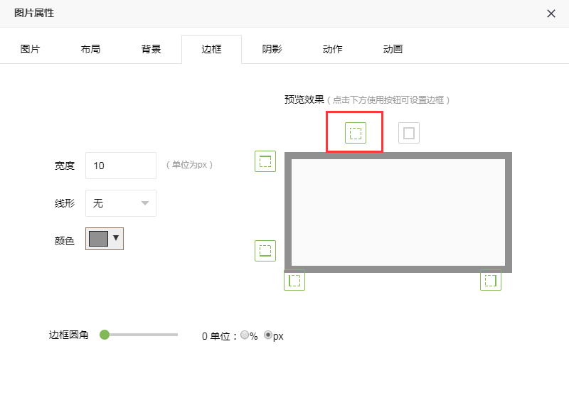 Step2:点击两处箭头所指的图标都可以进入【边框】的设置栏,在此可以设置边框的宽度、颜色以及边框的圆角。如图所示: