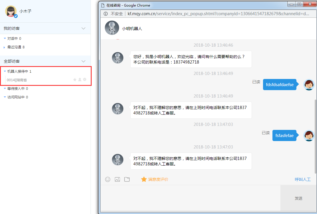 在网站上点击“在线咨询”,当收到访客的咨询信息后,只由机器人对此信息进行自动回复,如图所示: