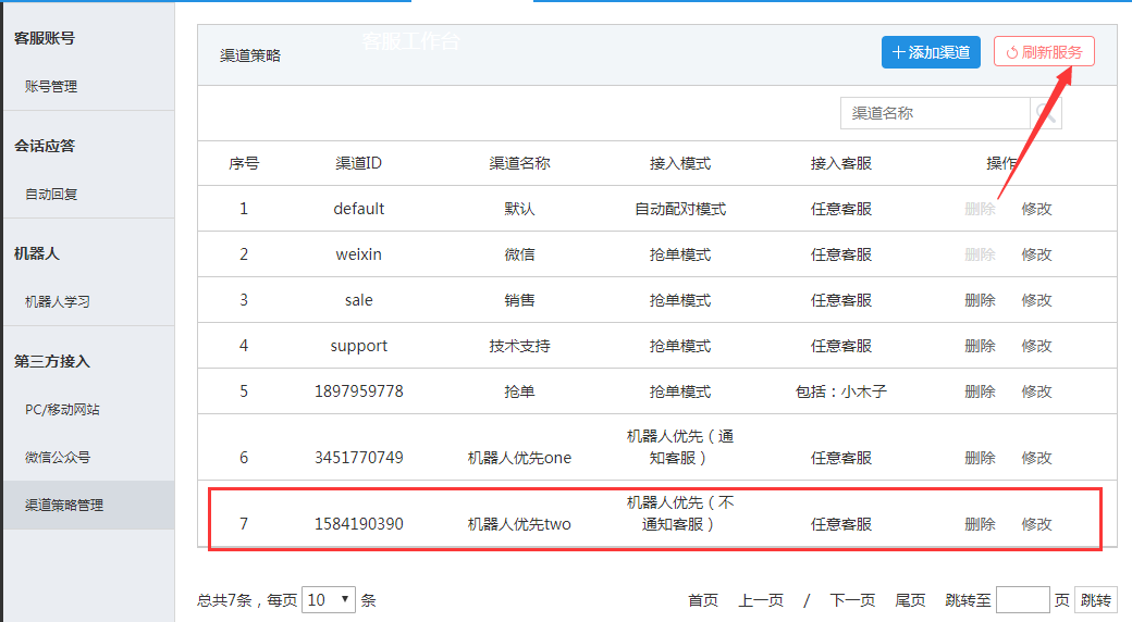在渠道策略管理中添加“机器人优先(不通知客服)”渠道,点击右上角【刷新服务】按钮。如图所示: