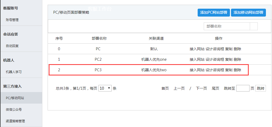 在“PC/移动网站”界面中添加关联渠道为 “机器人优先two”。如图所示: