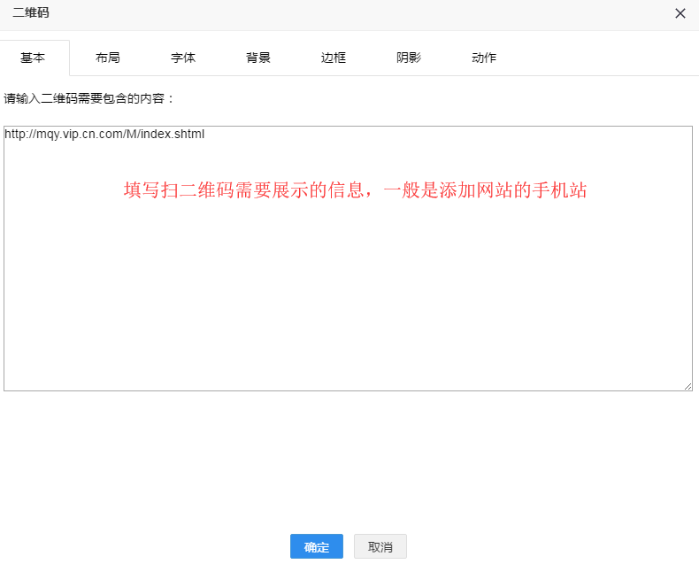 3、输入扫码需要显示的信息,可以是文字也可以是超链接,按照需求进行设置。点击【确定】按钮即可。