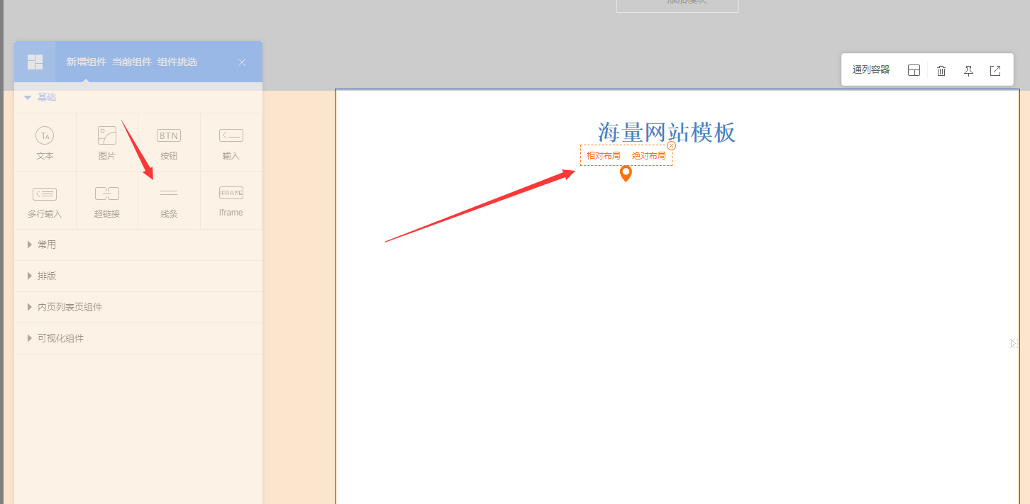 元素组件一般选择“绝对布局”。如果组件不好选中,可以使用快捷键,选中线条,按住crtl键,则可以锁定线条组件,进行选中设置。