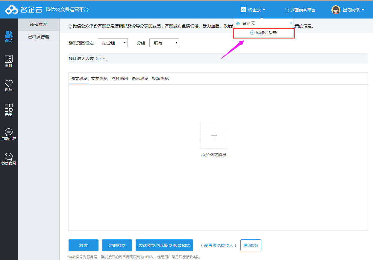 如果有多个公众号需要绑定,在内容发布模块页面右上角,点击当前微信公众号名称,在下拉菜单中,选择【添加公众号】功能,按提示完成授权操作,即可添加新的微信公众号,如图所示: