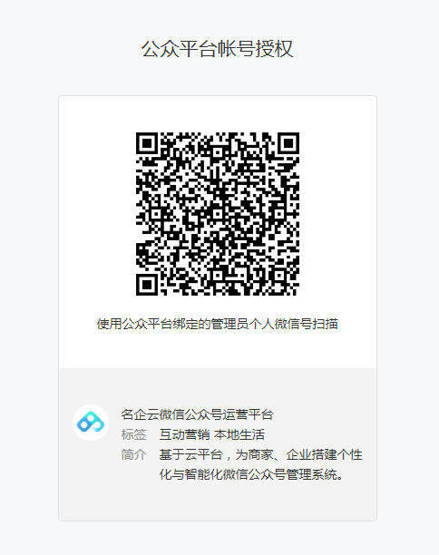 在主页中(http://www.mqy.com.cn,需登录),点击“一站式内容发布”模块下的“进入管理”按钮,若账号之前并未授权过任何微信公众号至本平台,则会跳链到微信公众号授权扫码页面。如图所示: