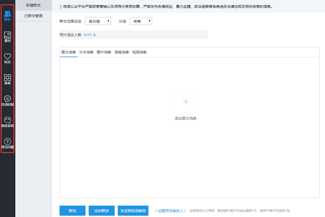 微信公众号内容发布与管理模块主要有群发、素材管理、粉丝管理、菜单管理、自动回复、微信官网、常见问题7个栏目。