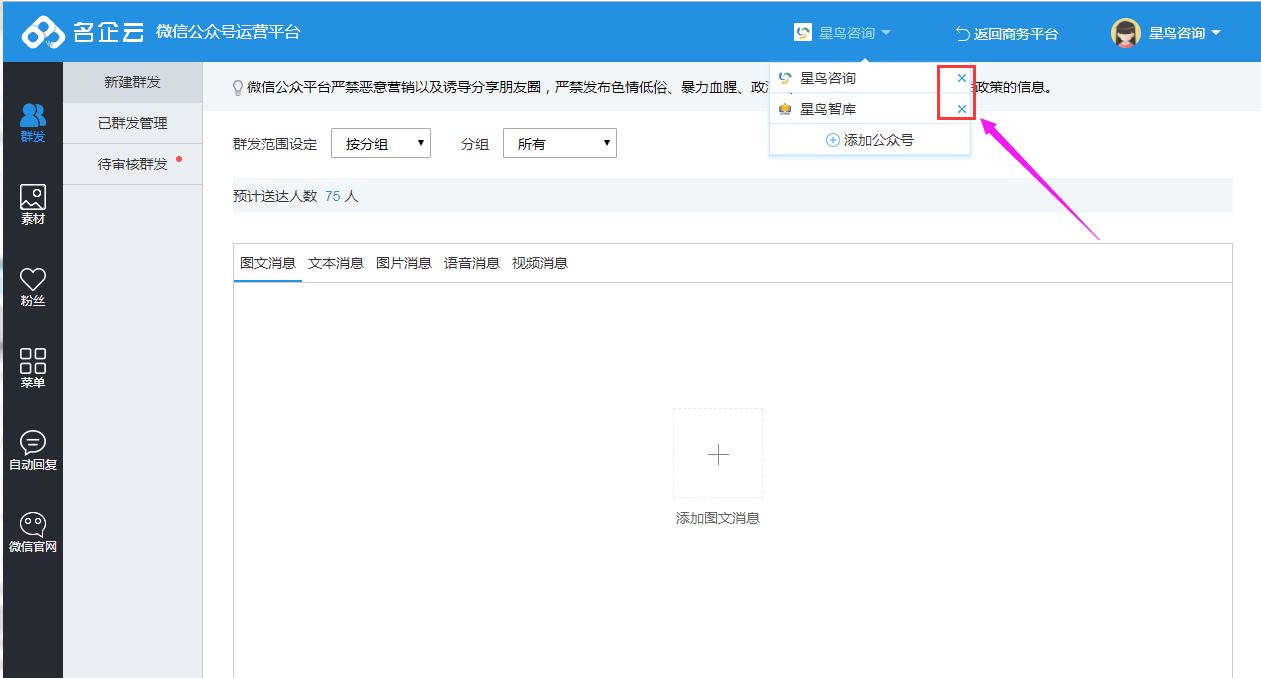 点击右上角的微信名称,出现下拉选项,点击待删除微信公众号后面的删除小图标,再点击确认即可。