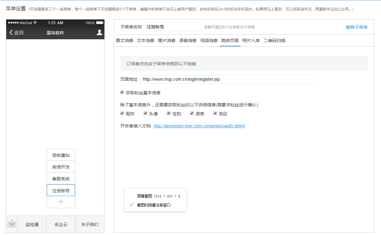 第一步:在微信菜单中设置你的页面。