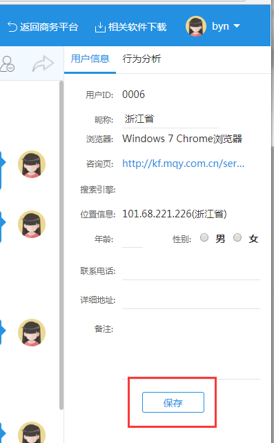 在客服工作台上的右侧提供用户信息查看与修改功能,可对当前用户进行信息设置,点击“保存”后即完成对当前用户的信息修改。展示界面如下: