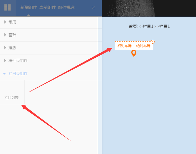 将【栏目列表】拖至页面,选择 绝对布局。如图所示: