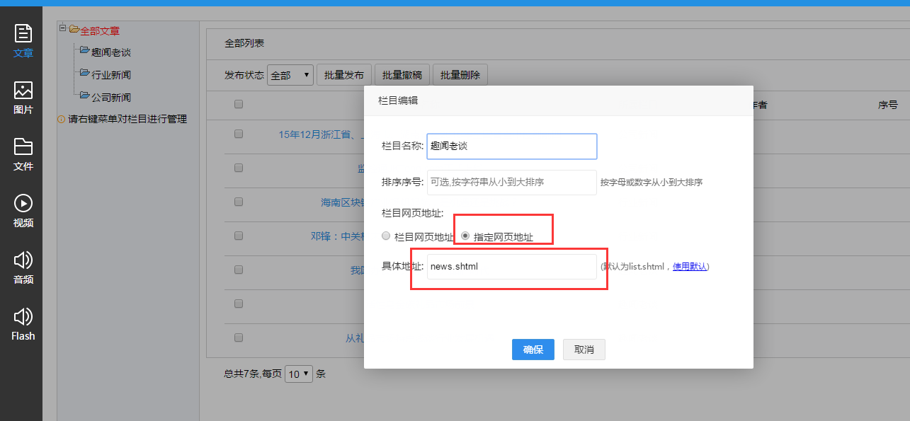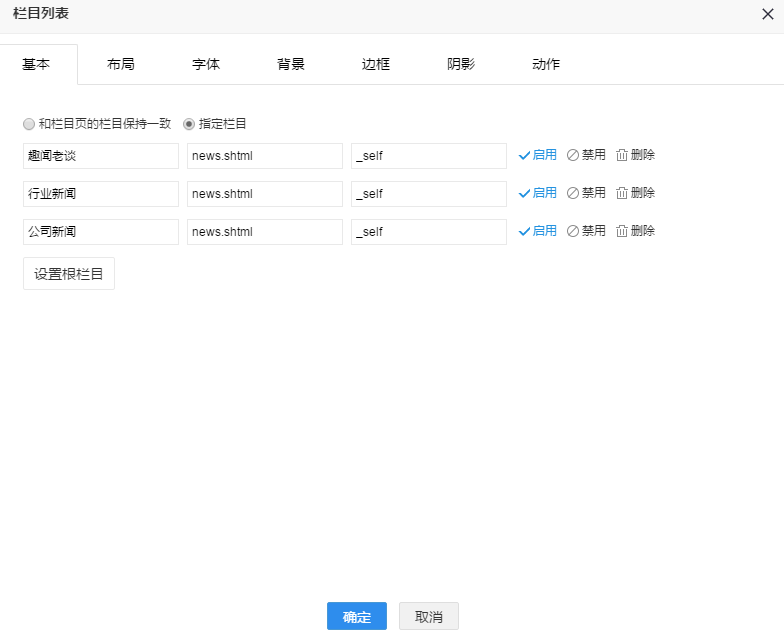注:通常栏目少的情况下,选择 “指定栏目”。如果栏目很多且风格一致则可以选择 “和栏目页的栏目保持一致”。