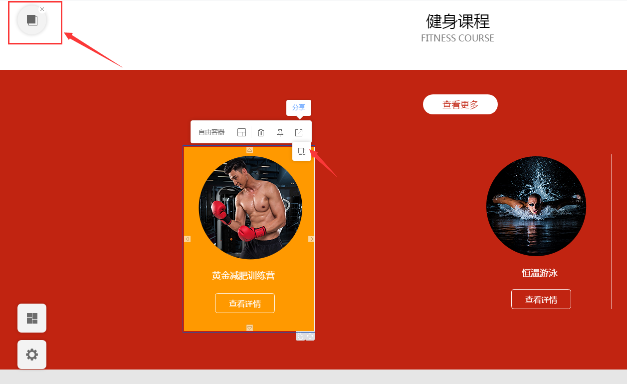 将鼠标移至自由容器上,自由容器顶部会出现设置快捷栏,点击红色箭头处,页面会出现红色框的图标,将图标拖至需要设置自由容器的目标处,松开鼠标,则成功复制了一个自由容器。如图所示: