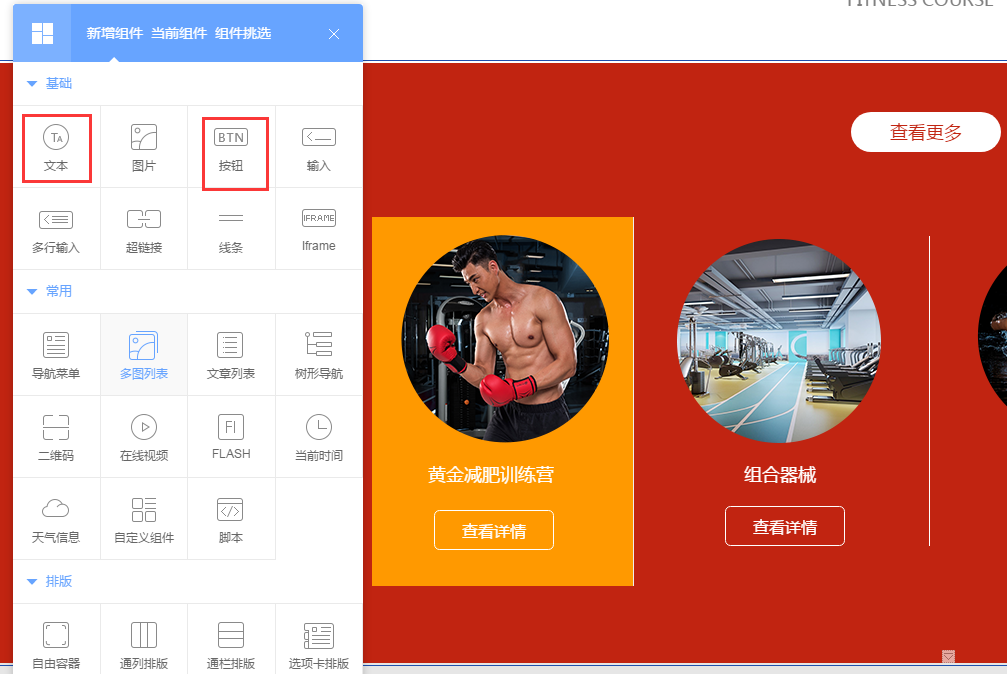 自由容器模块内支持添加文本、图片、按钮三种模块,通过简单拖拽,可对文本、图片、按钮进行自由排列组合。通过自由容器模块,可实现丰富的展示效果,如下图: