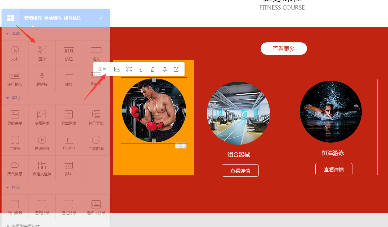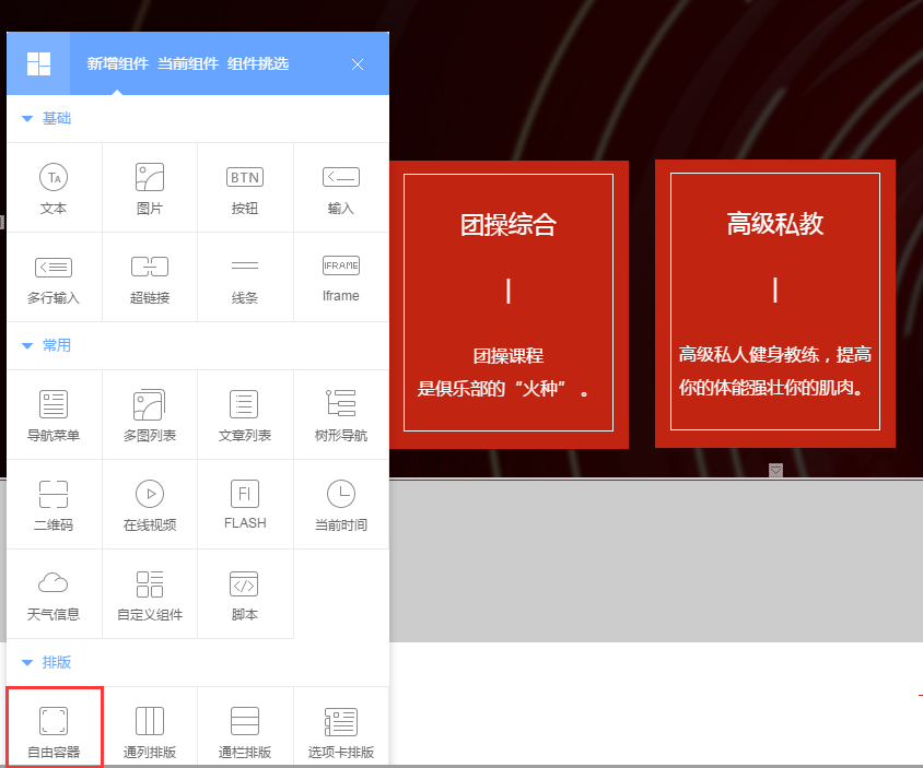 在弹出的面板中点击红色框中的“自由容器”,即可添加自由容器模块至页面中。