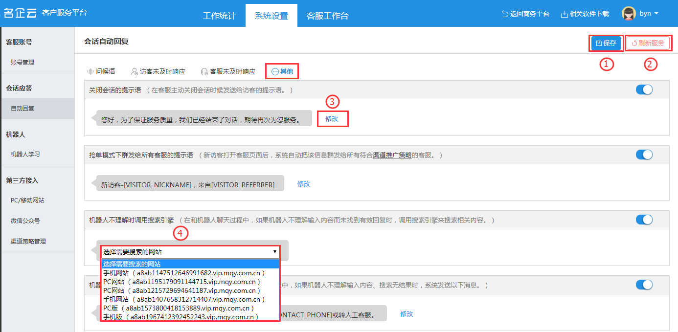 在此模块可设置在关闭会话时、抢单模式下系统自动回复的信息内容,以及在和机器人聊天过程中,如果机器人不理解输入内容而未找到有效回复时,调用搜索引擎来搜索相关内容和在和机器人聊天过程中,如果机器人不理解输入内容、搜索无结果时,系统发送的消息内容。界面如下: