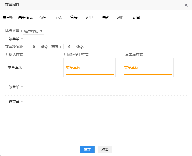 (1)对模板中已有组件进行调整:各组件内容及样式均支持自定义调整(修改、删除均可)。以导航菜单为例,点击菜单修改工具条,即可对导航菜单进行自定义调整。