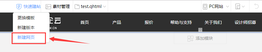 (3)添加新网页:点击左上角的“快速建站”,再点击下拉菜单中的“新建网页”,即可创建新网页。