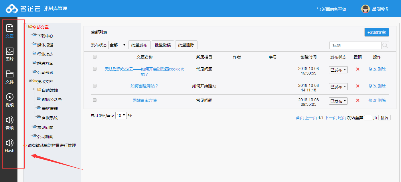 网站设计好之后,需要对网站内容进行日常更新与维护。用户可通过“素材管理”模块实现对网站文章、图片、文件、音频及视频文件的更新。