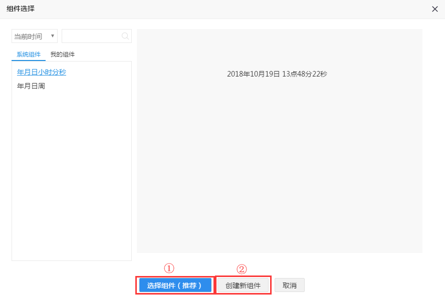 1.在模块①中,系统提供了两个常用的时间类型的组件,选择合适的一个组件,点击【选择组件(推荐)】即可。