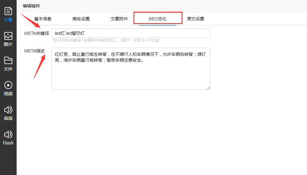 通过左侧页面设置 -【基础设置】-【页面设置】,设置网站首页和栏目页面的优化关键字。