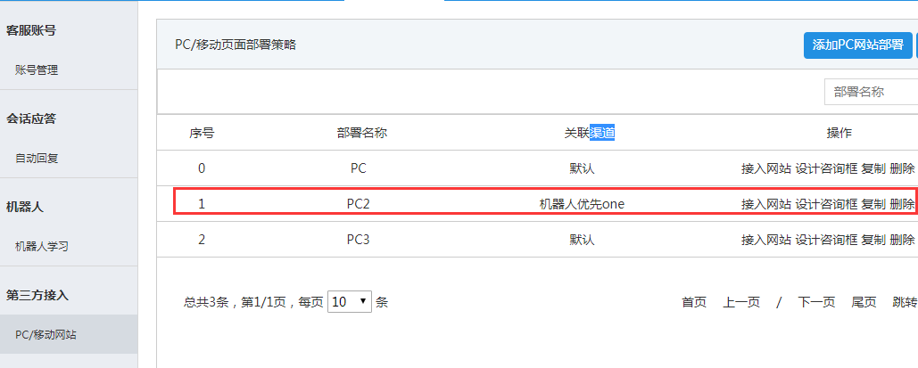 在“PC/移动网站”界面,添加关联渠道为 “机器人优先one” ,如下图所示: