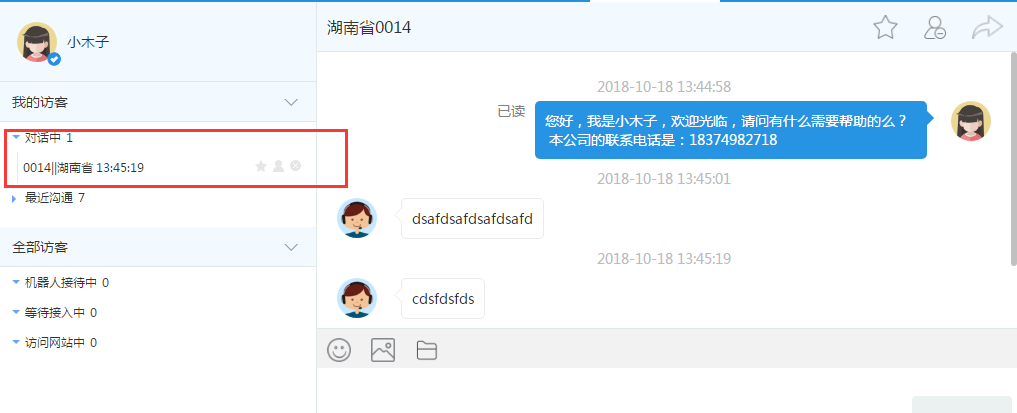 在网站上点击“在线咨询”,当收到访客的咨询信息后,先由机器人对此信息进行自动回复并通知客服,如图所示: