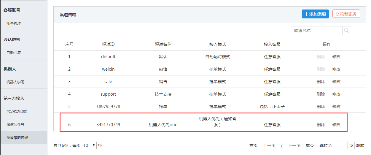 在渠道策略管理中添加“机器人优先(通知客服)”渠道,点击右上角【刷新服务】按钮。如图所示:
