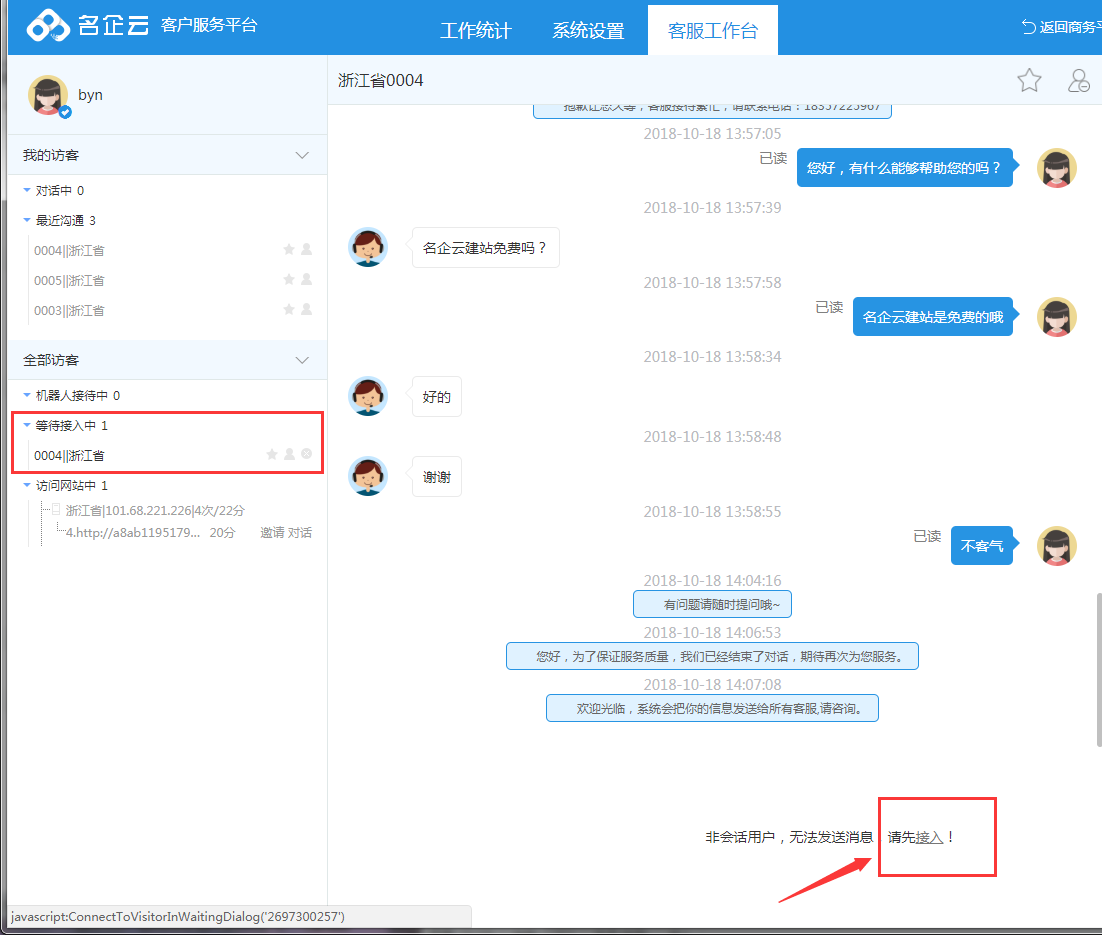 当访客发送咨询信息过来后,在客服工作台上的左侧菜单栏中会显示等待接入客户信息,此时默认是非会话用户,无法直接发送信息给访客,需要接入后才能给访客提供咨询服务。点击下图中的“接入”即接入成功。