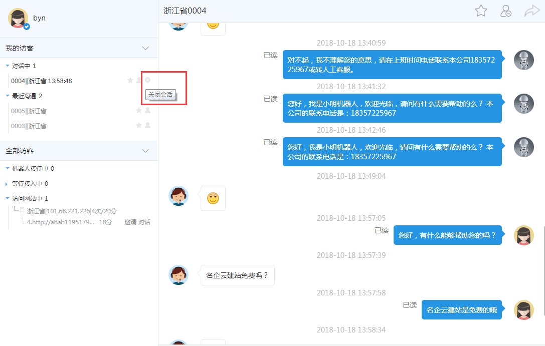 在客服工作台上的左侧菜单栏中会显示正在对话的用户信息,当和用户完成对话后,结束会话只需点击下图中的“关闭会话”按钮即可结束当前聊天对话框。界面如下图所示: