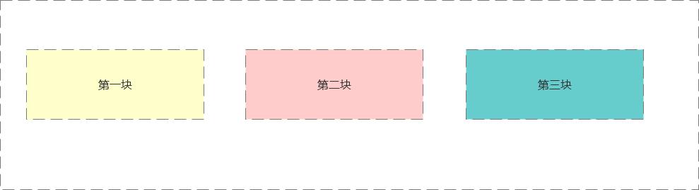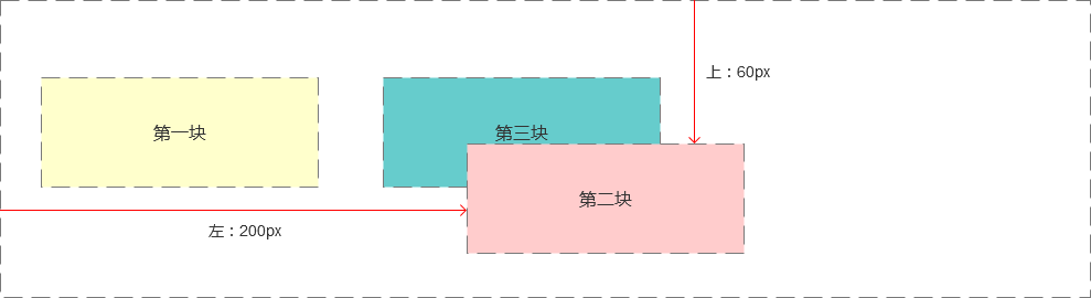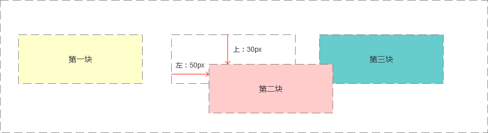 这时我们发现第二个块针对它本身位置的起始点进行了一个偏移,但是它原来所占据的那个位置空间依然还在(虚线框标示的地方),即使我们把偏移量设置得再大一点,使它完全离开原来的位置,它原来位于文档流中的位置仍然会存在,不会被第三个块浮动过来填补掉。