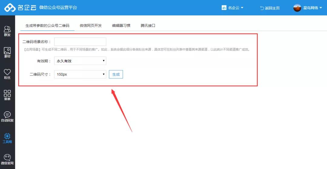 其次,进入“工具箱”模块下的渠道二维码生成界面,设置二维码场景名称、设置有效期、设置二维码尺寸后,点击生成即可。如图所示: