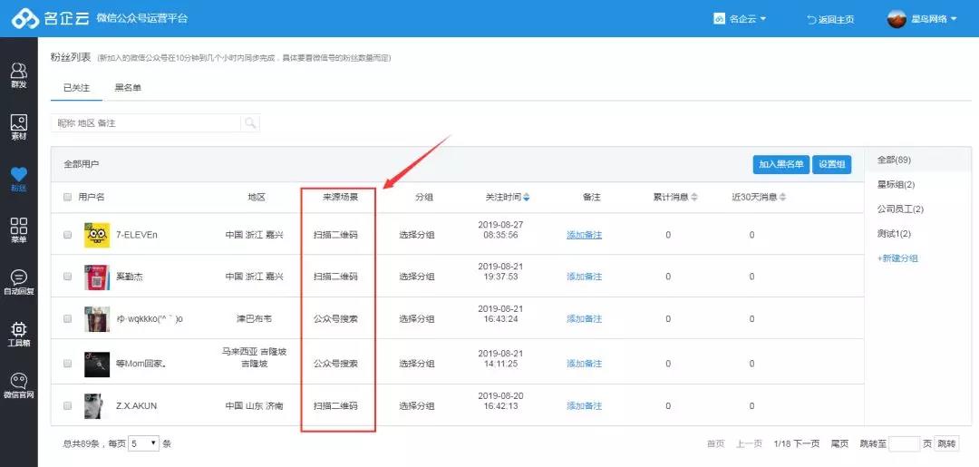 用户可在粉丝模块中,查看微信公众号各渠道粉丝来源,如下图所示: