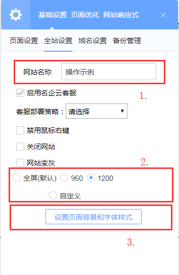 说明:建议开始建站时,优先设置好网站名称、网站页面宽度(重点!可能影响整个网站展示)、页面字体及背景,其他全站设置可在建站之初或者建站完成后设置均可。