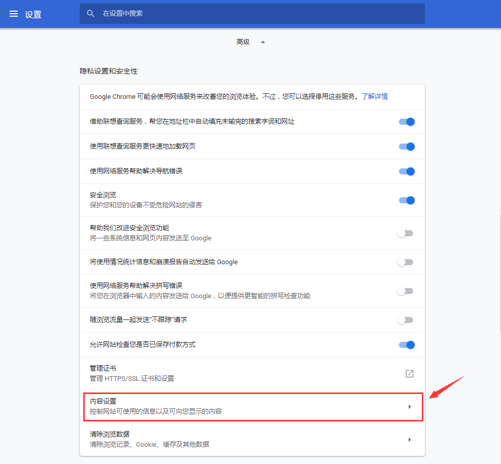 3.选择高级设置中的“内容设置”。