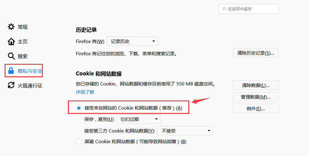 2.选择“隐私与安全”,在cookie和网站数据模块,选择“接受来自网站的 Cookie 和网站数据”,设置完后,再登录名企云即可。