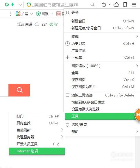 2. 之后选择菜单下的工具, 接着选择工具下的Internet选项。