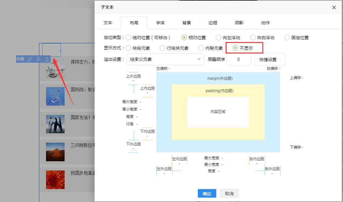 鼠标移至需要隐藏的组件元素上,点击红色框中图标,弹出设置页面,如图所示: