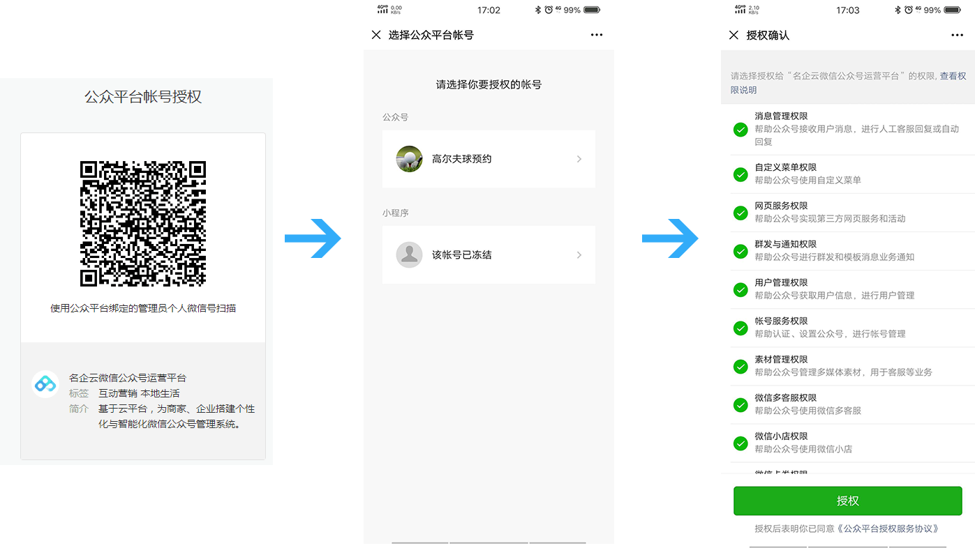 在添加微信公众号授权至平台时,均会有微信授权操作。