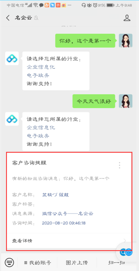 微信公众号运营者只需授权相关权限给“名企云”,开启粉丝消息及文章留言提醒功能后,在名企云公众号中绑定平台账号即可实时接收互动消息提醒通知,当然也可通过手机短信接收提醒。