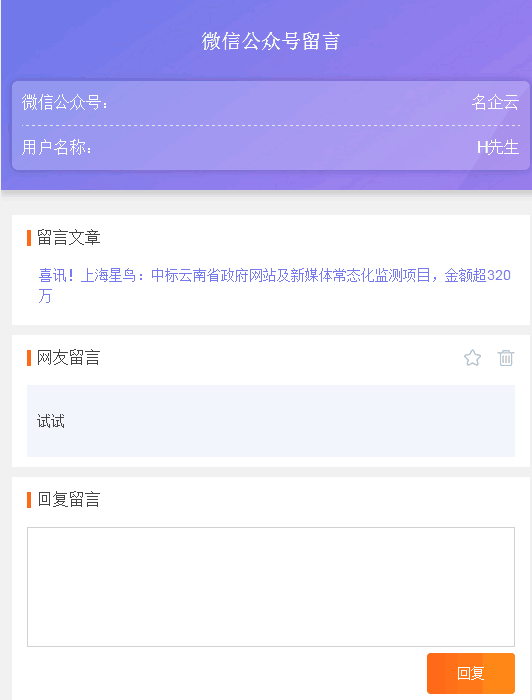 点击查看详情,可查看留言详情,并支持在线回复网友留言,同时还支持标星及删除留言。