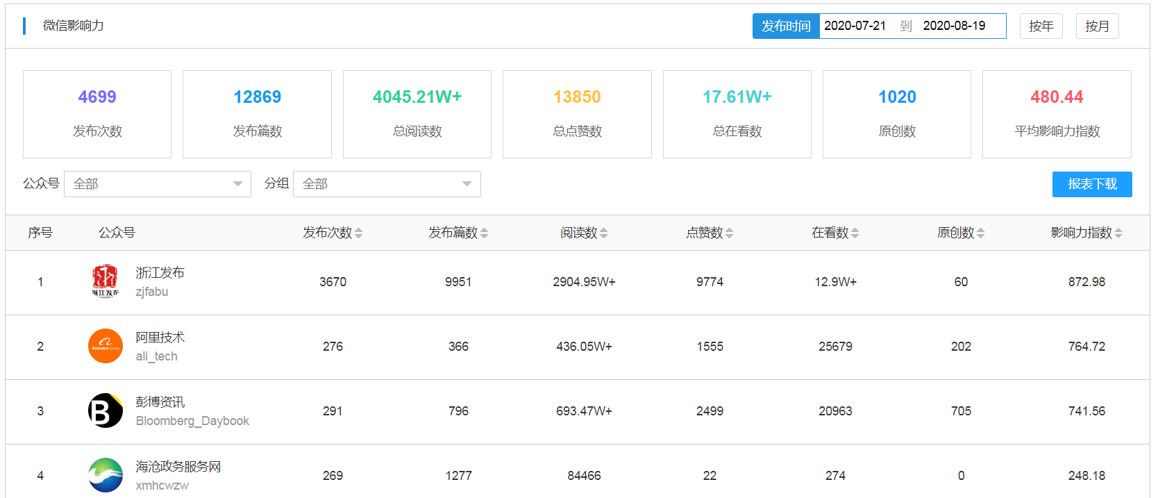 以下是我司政务新媒体监测平台的影响力传播榜单: