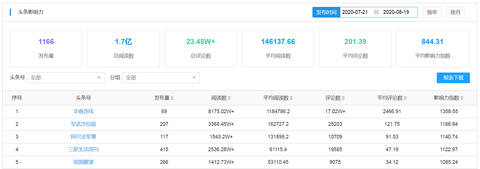 至于用什么数据呢,当然是能综合反映新媒体整体影响力的传播指数啦!星鸟公司已推出影响力传播指数,可为微信、微博及头条等提供标准化评测指数,不同新媒体影响力指标均综合采用多纬度指标按照传播算法模型计算得出,如此就能客观地对比分析同类型新媒体在任意时间段内的传播影响力情况。