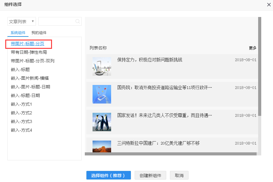 2、点击【系统组件】-【带图片-标题-分页】组件,点击【选择组件(推荐)】。如图所示: