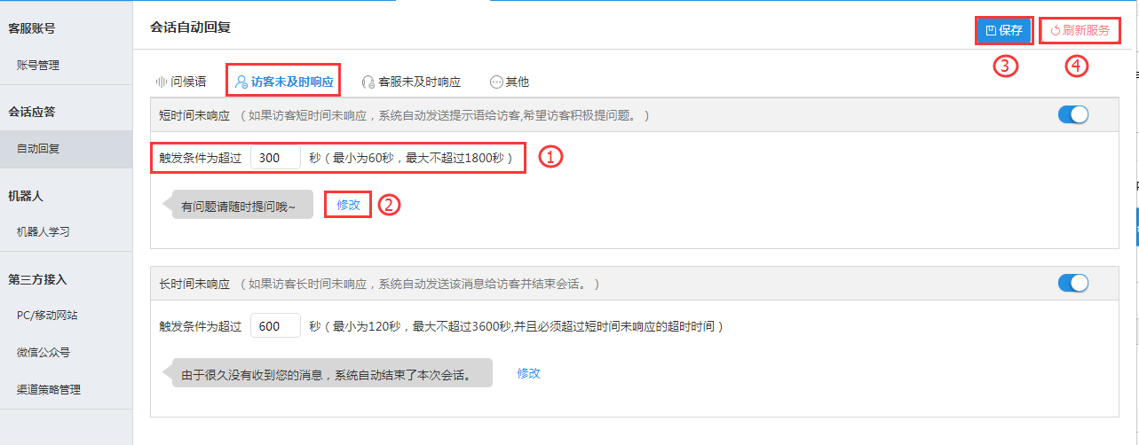 1. 在模块①中,可自行设置访客未及时触发条件时间(主要分为短时间未响应和长时间未响应两种情况),当超过所设置的时间后,系统自动发送消息给访客。