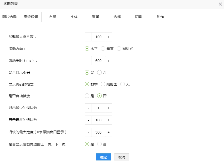 3. 点击红色框中 多图列表 按钮,弹出设置属性窗口。如图所示: