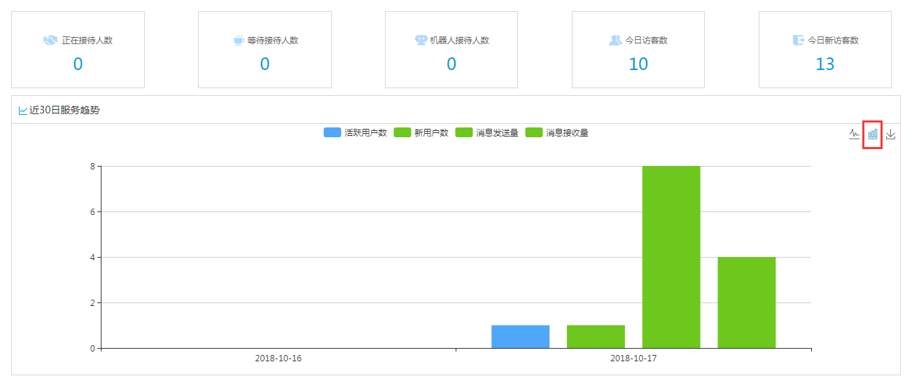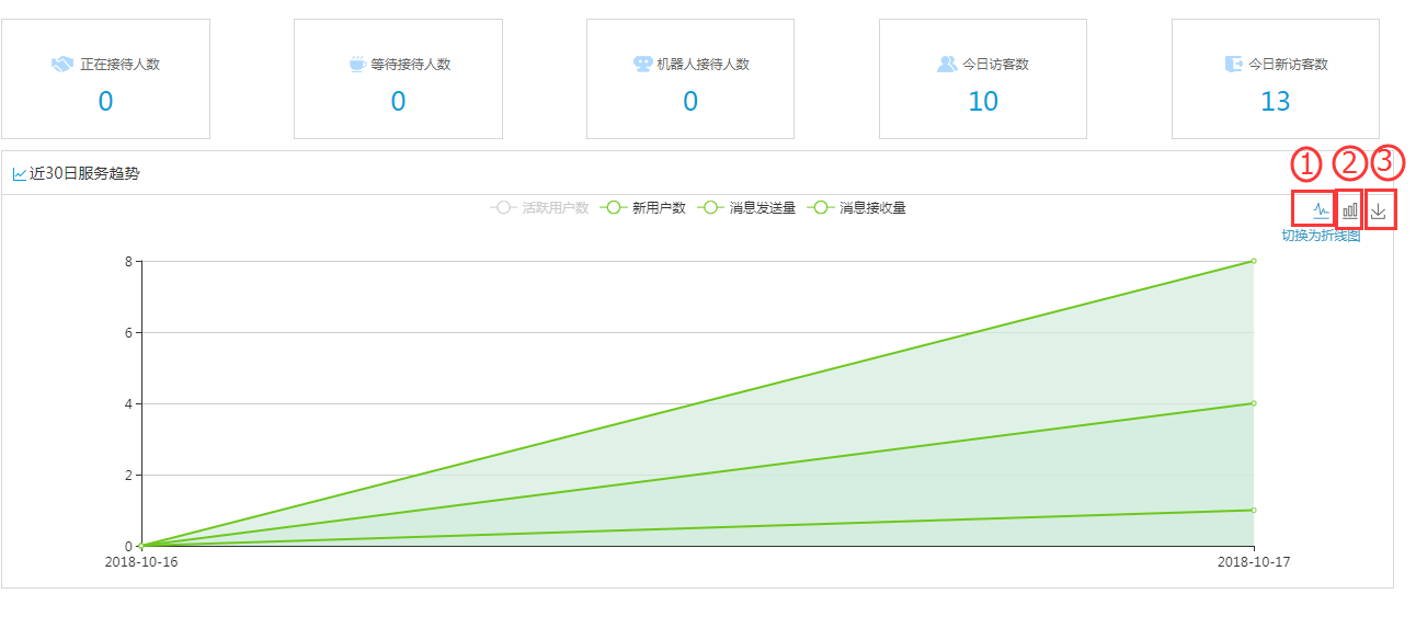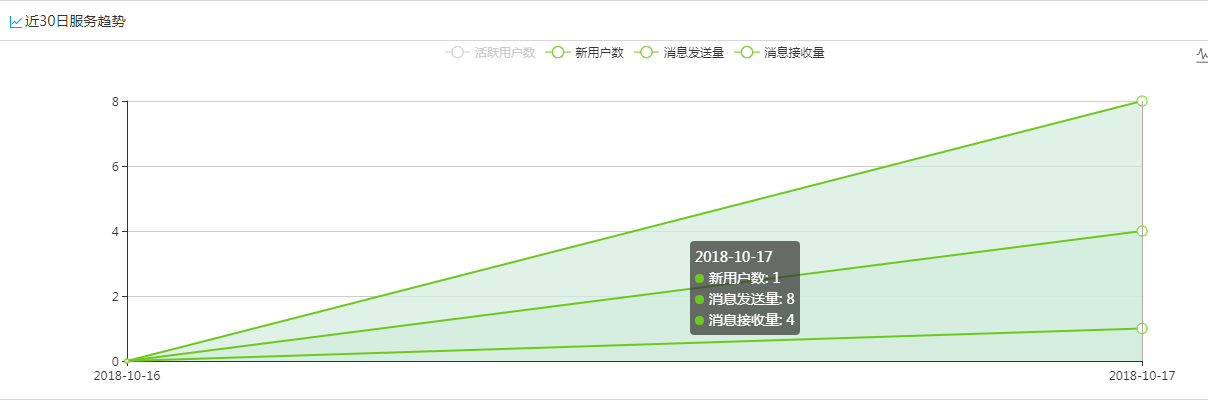 2. 统计近30日服务趋势,分别统计活跃用户数、新用户数、消息发送数、消息接收量。系统默认4种数据全部进行统计,但可以根据实际情况对某一组或几组数据进行统计。具体操作如下: