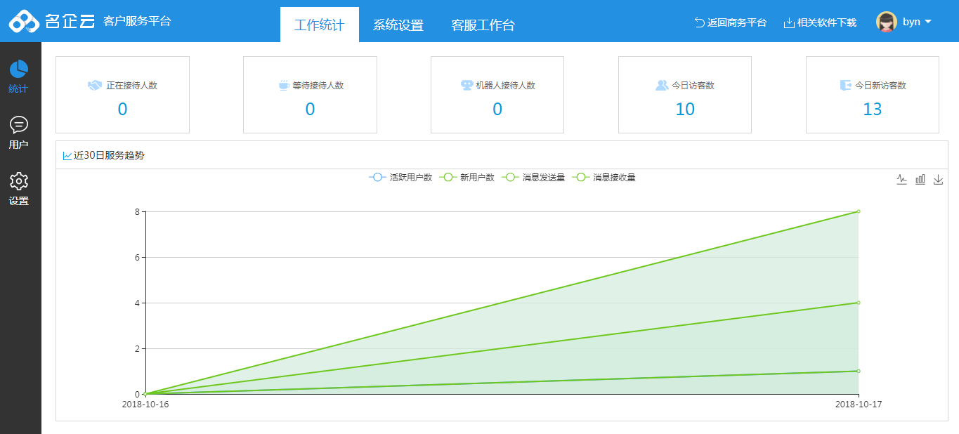 1. 统计当日正在接待人数、等待接待人数、机器人接待人数、今日访客数、今日新访客数。可以更加直观的了解网站的访问率,网站流量(流量实际上是用户访问网站的数目)也可以帮助优化者了解到这个网站有哪些地方得到了浏览者的青睐,更好的优化网站。