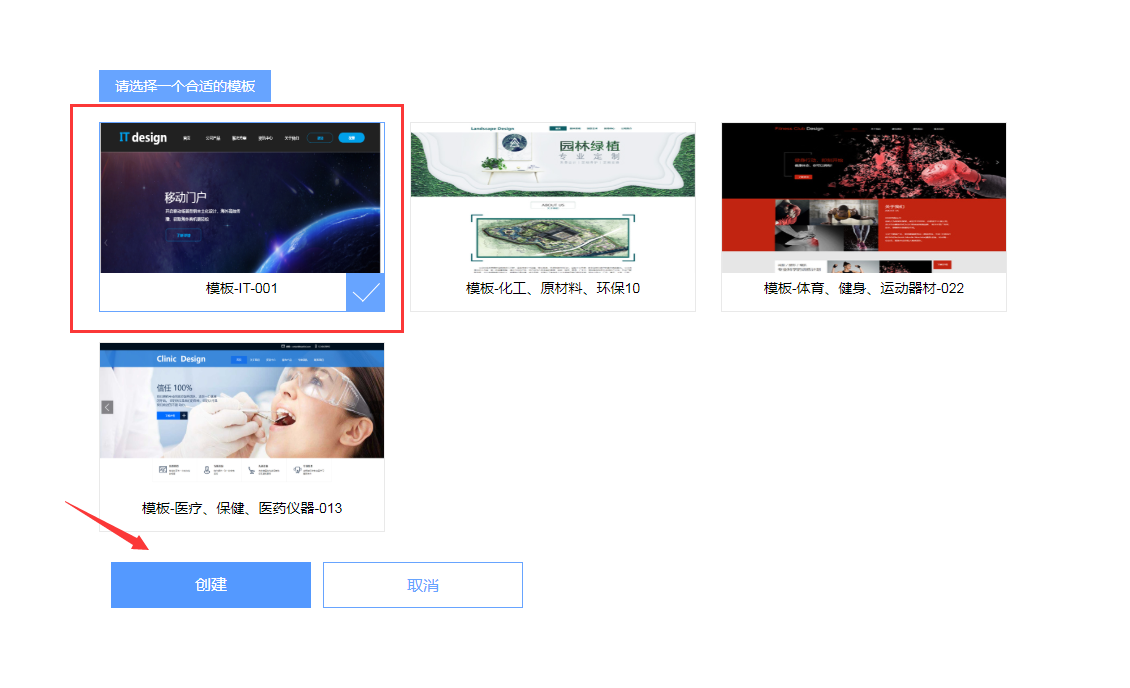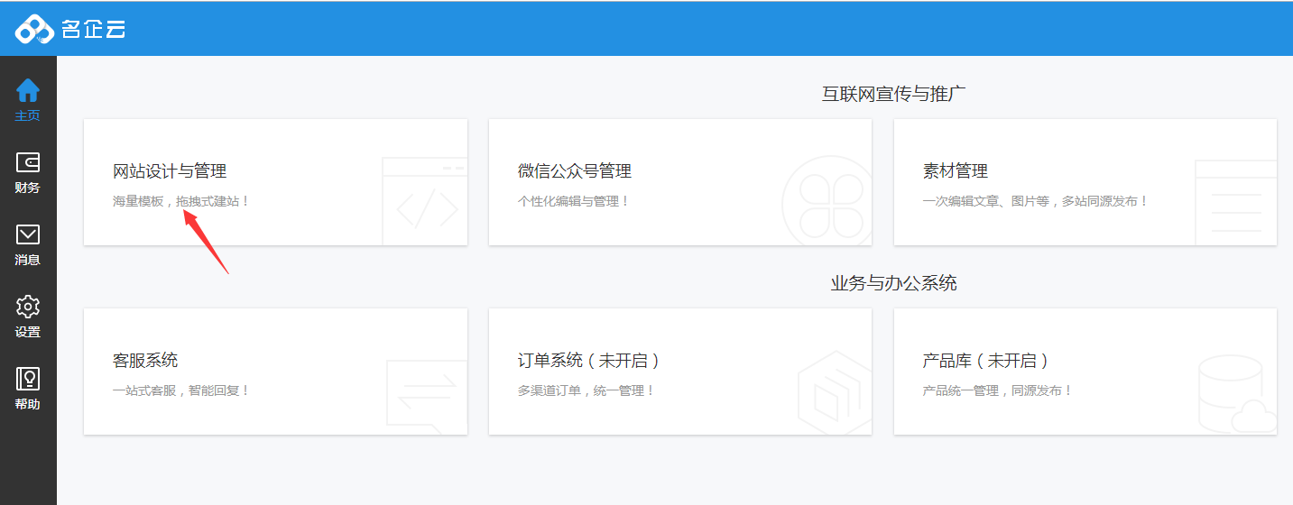 注册完了以后,系统会自动跳转到主页,点击网站设计与管理,选择模板,就正式开始建站了。