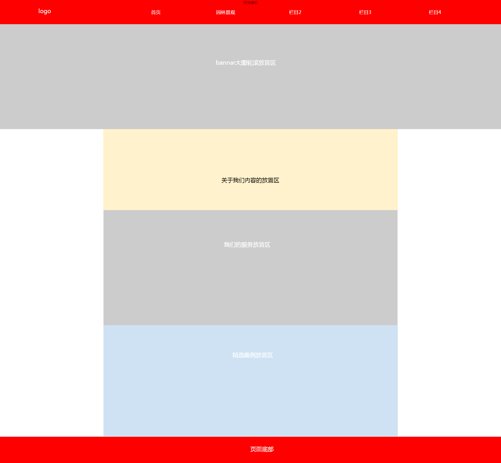 现在,整体框架已经搭建完成,剩下的就是在框架里面进行添砖加瓦了。具体介绍请看“如何实现灵活的网页布局”。注:内容区域的大小后期可以根据需求进行拖动,内容区域可进行复制、更换、互换等操作。