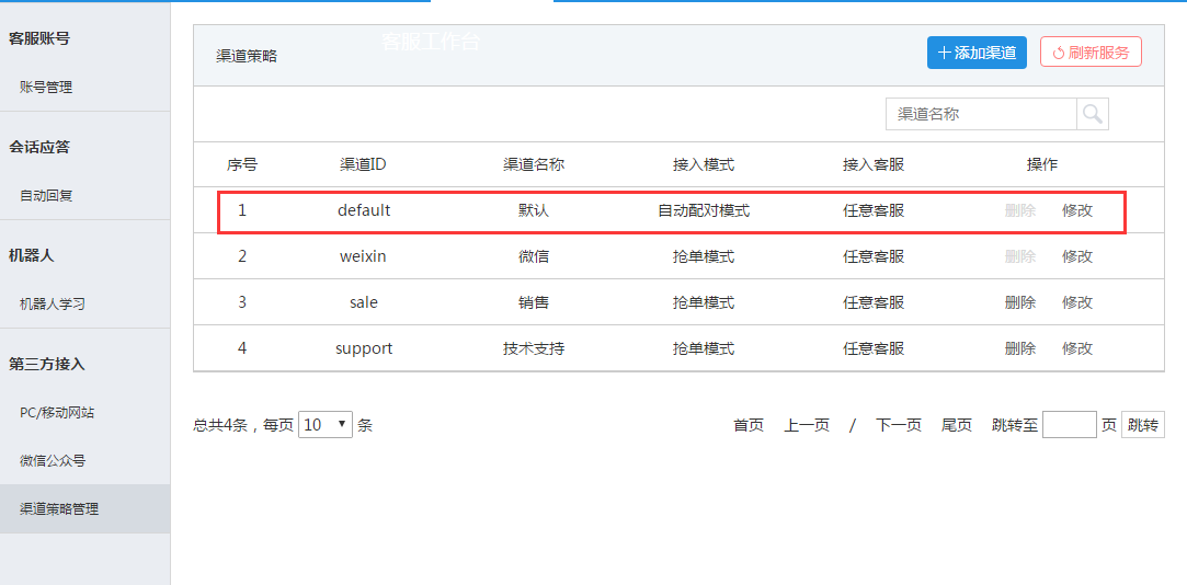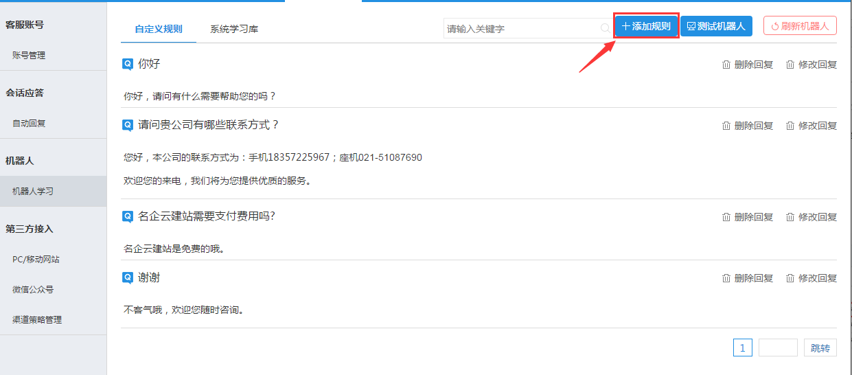 注:增加完规则以后,一定要点击【刷新机器人】按钮,新增规则才能生效。