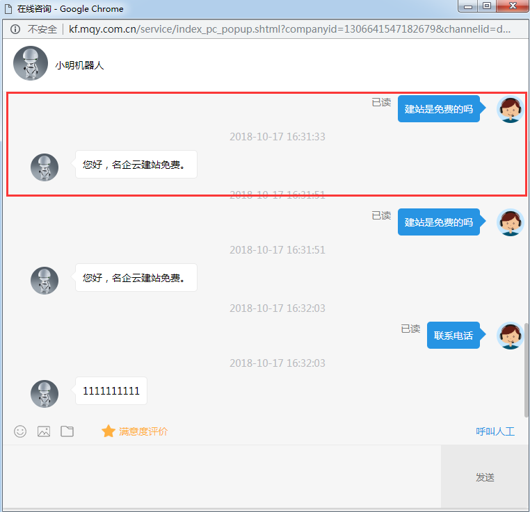 然后点击网页上的“客服咨询”,当输入相关问题后,系统会自动配对,进行自动回复。效果如图所示: